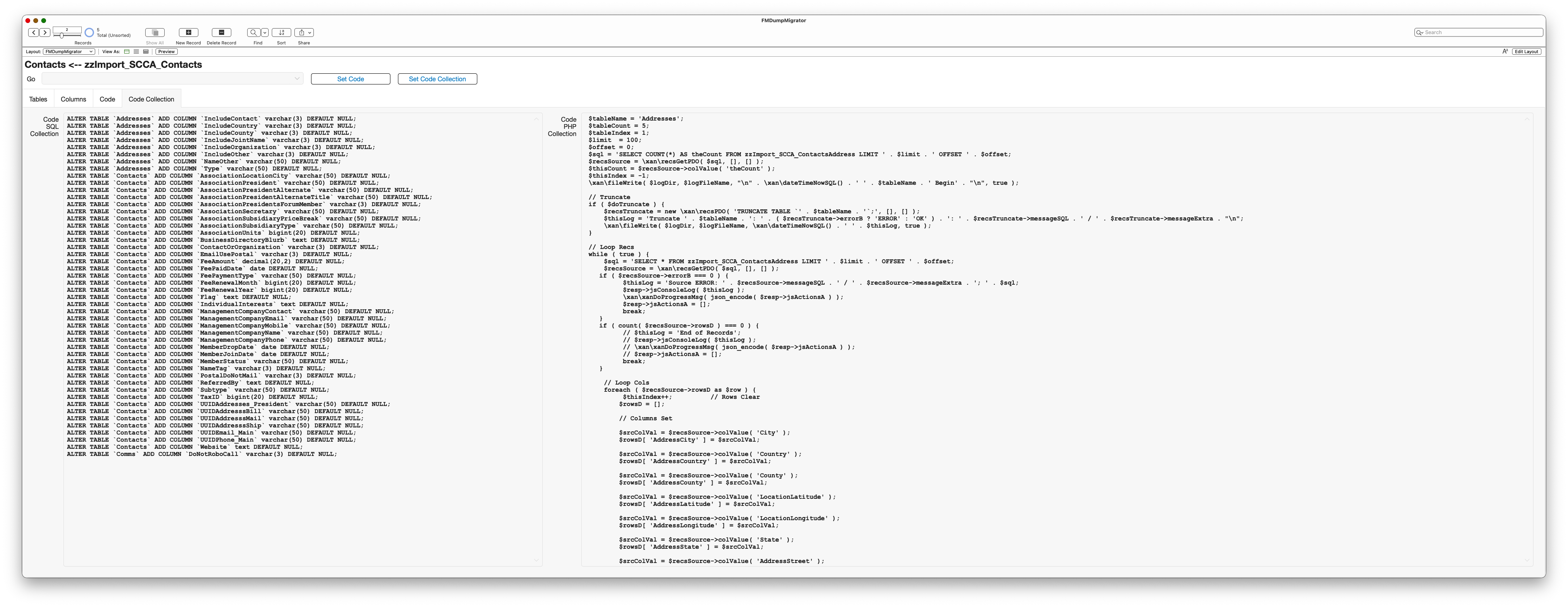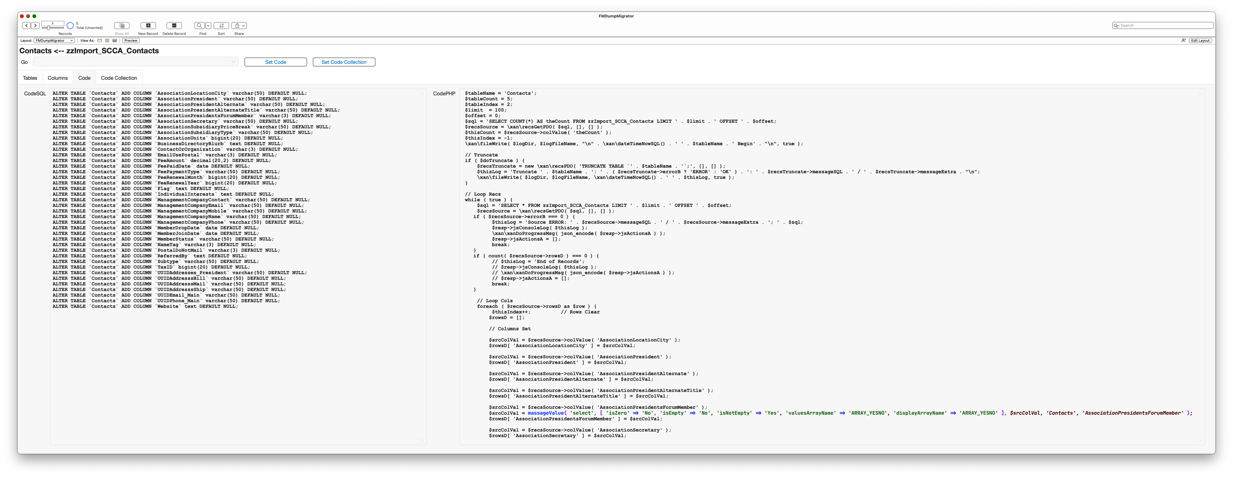 Step 3: Generate Code! Left side is SQL to generate the new columns. Right side is PHP code generated to move and massage the data using the Massage Rules.