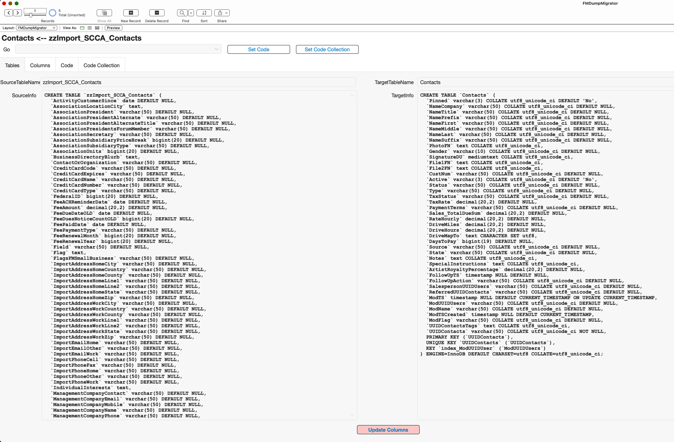 Step 1: Paste CREATE TABLE statements from FMDump for the Source and from an existing MySQL table for the Target. Then click the Update Columns button.